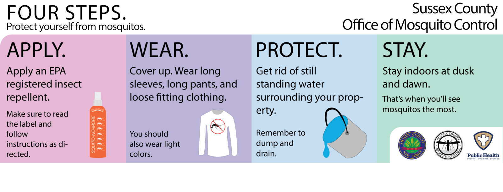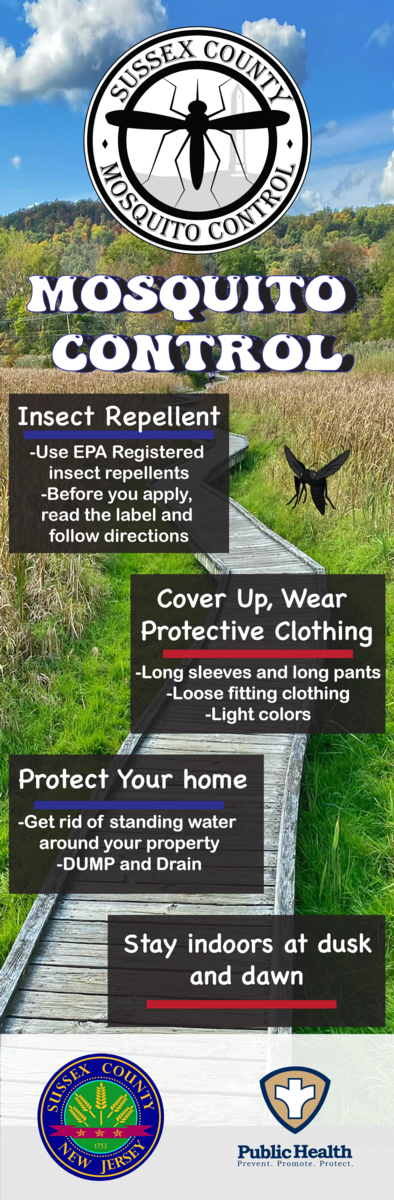 The Office of Mosquito Control held an Informational Poster Contest for local Sussex County high school graphic arts students for a “Prevent Mosquito Bites” stand alone retractable banner design. The designs were required to showcase the effective ways of mosquito bite protection such as using insect repellent, covering up and wearing protective clothing, and the various ways to rid of standing water around private property.