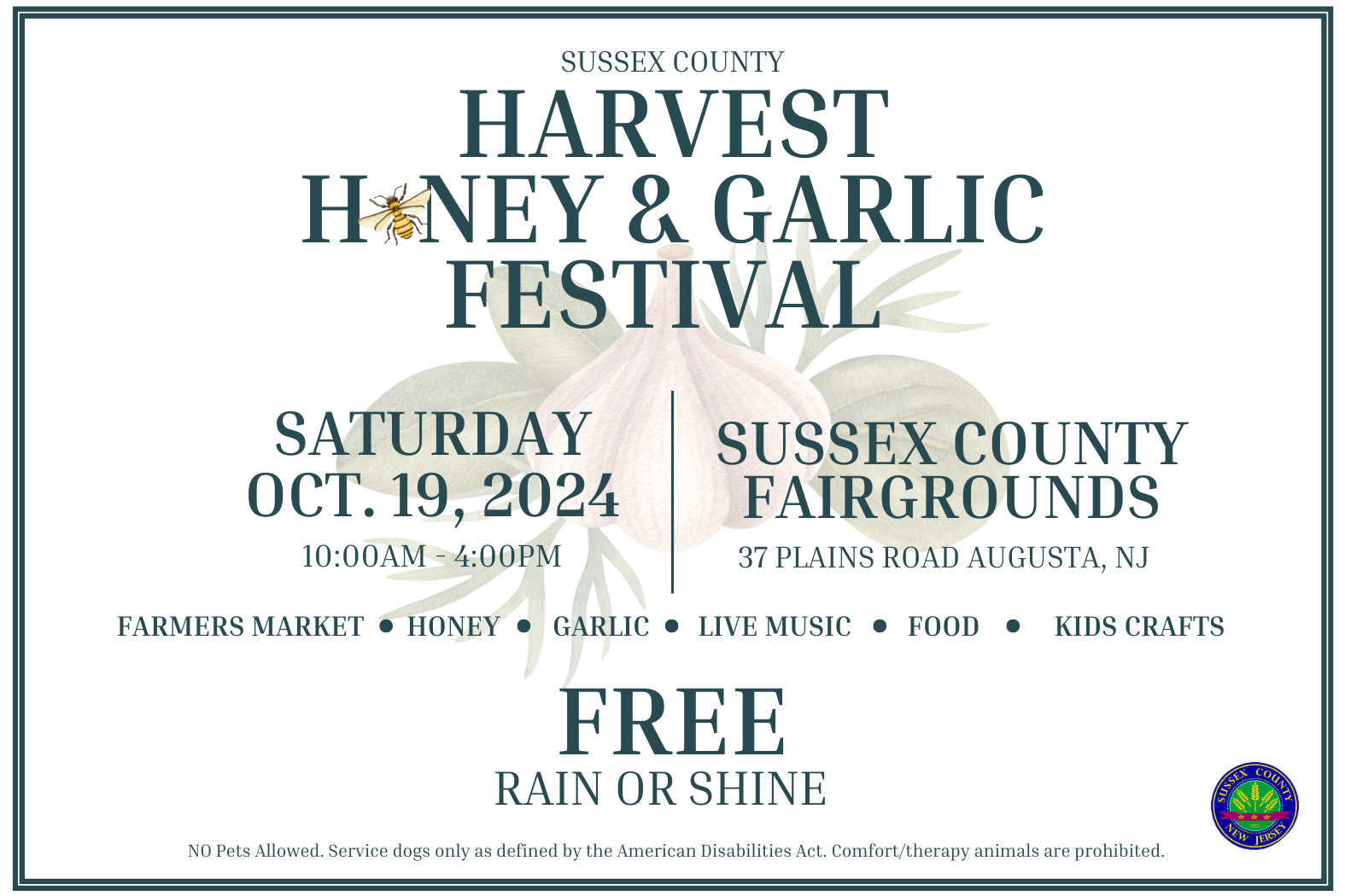 The weather this Sat is perfect for the Harvest Festival! Join us Oct. 19 from 10am-4pm for the 13th Annual Harvest, Honey & Garlic Festival, at the Sussex County Fairgrounds! The Sussex County Beekeepers Association will have educational displays and materials along with an array of honey products. For those who love all things garlic, you’ll have plenty to choose from with the Garden State Garlic Growers. The festival will include a live band, local artisans, crafters and food vendors plus displays highlighting northern New Jersey’s great open spaces and natural history. Kids can enjoy a hay ride, pumpkin painting, face painting and crafts. The Sussex County Harvest, Honey and Garlic Festival is a free, family event. We hope to see you there! No pets allowed.